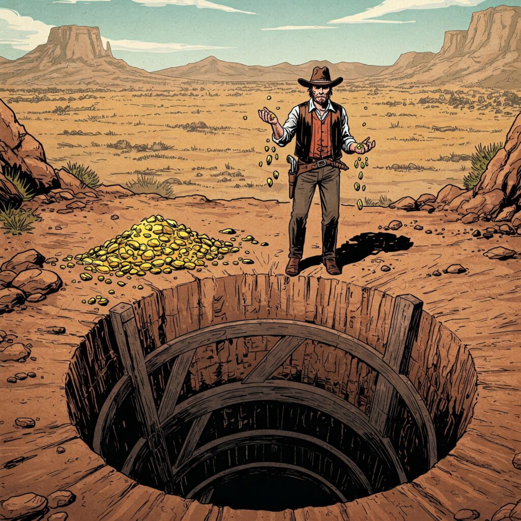 Nach einer erschöpfenden, tagelangen Wanderung durch die unbarmherzige Hitze und die tückischen Schluchten stieß Elias auf eine versteckte, unscheinbare Senke, in deren Mitte sich der verlassene, moosbewachsene Schacht gähnte. Die frischen Werkzeugspuren am Rande und der fast bis zum Rand gefüllte, rostige Öleimer ließen sein müdes Herz schneller schlagen – jemand war vor ihm hier gewesen und hatte offenbar etwas gefunden. Doch als er vorsichtig und tastend in die dunkle Öffnung hinabstieg und das glitzernde Funkeln unzähliger goldener Stücke im trüben Licht seiner mitgebrachten Lampe entdeckte, hörte er plötzlich ein verdächtiges Geräusch am oberen Schachtrand. Billys finstere, von Habgier und Wut verzerrte Gestalt zeichnete sich bedrohlich gegen den hellen Himmel ab. Es stellte sich heraus, dass Billy, von Neid und Misstrauen getrieben, Elias heimlich verfolgt hatte, fest entschlossen, ihm seine mögliche Entdeckung mit Gewalt zu entreißen. Es entbrannte ein erbitterter, verzweifelter Kampf am gefährlichen Rande des tiefen Abgrunds, in dem sich die aufgestaute Frustration, die Enttäuschung und die nackte Verzweiflung beider Männer auf brutale Weise entlud.